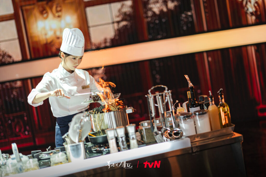 O duelo final acontece na floresta onde rei e chef se conheceram. Heon leva o mangurok, o livro de receitas que ele mesmo escreveu e ilustrou com cada prato de Ji-yeon — o mesmo livro que a puxou no tempo graças à mensagem apaixonada dele. Na luta, Ji-yeon salta na frente da espada de Jesan e é ferida mortalmente. Sangrando nos braços do amado, confessa que queria ficar. É aí que o mangurok, ativado pelo sangue dela, a puxa de volta para o presente. Heon mata Jesan e fica só — pelo menos por enquanto.